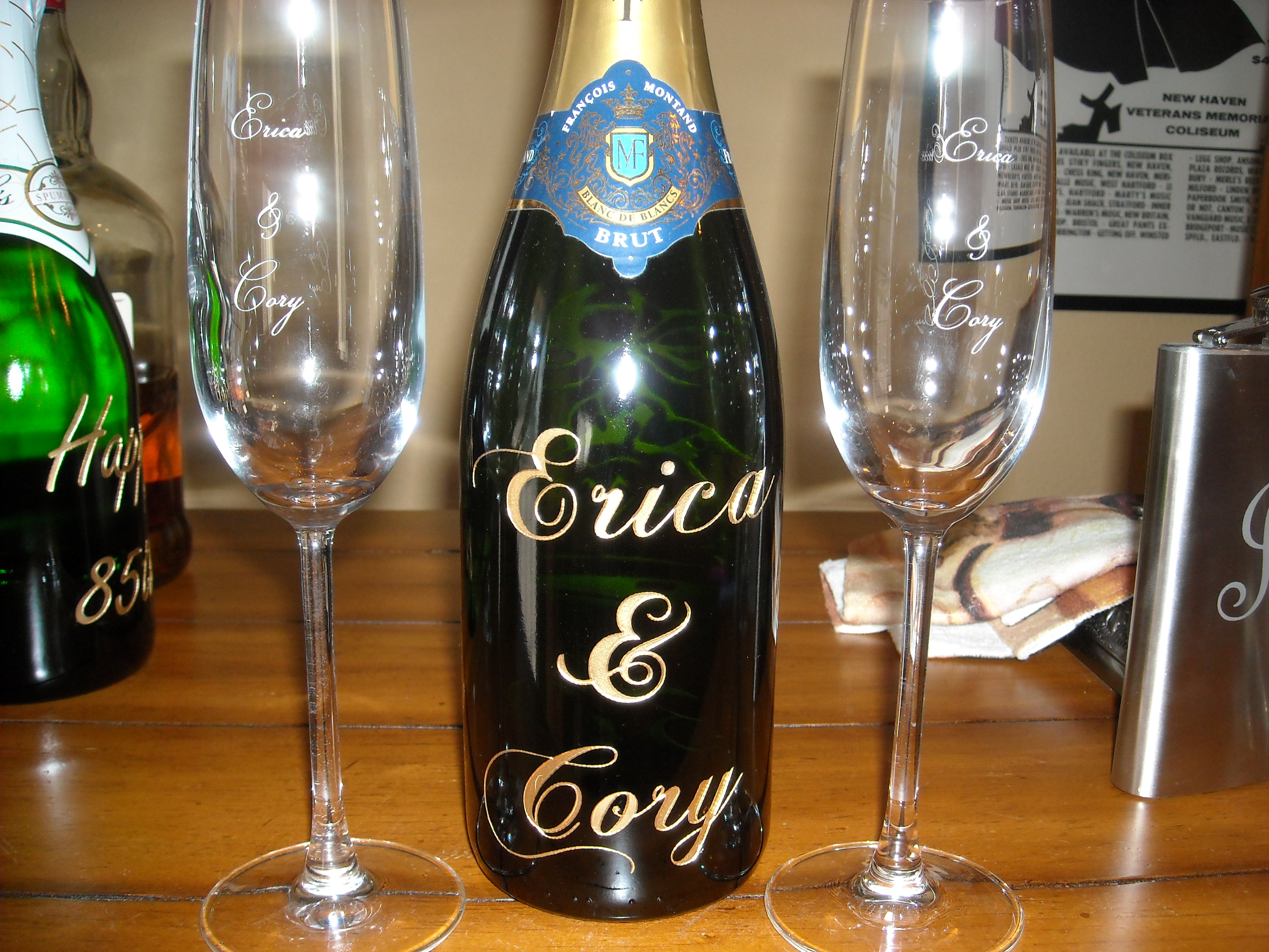Champagne bottle & flutes Published June 30, 2012 - size: 3264 × 2448 in Champagne bottle & flutes← PreviousNext → For weddings, I etch champagne bottles and flutes. I backfill the etched bottle with gold spray paint.