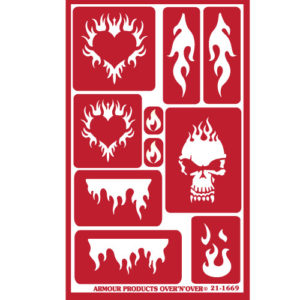 Flame Art Reusable Glass Etching Stencils. This package includes a 2.25″ x 1.25″ skull in flames, two 2 in x 2 in hearts on fire, A set of 2.25″x75″ flames in the upper right corner and a set of 1″x2.25″ flames in lower left corner. In the center is a small set of lighter flames. Stencils and instructions are included in this package of our product 21-1669-ONO Flames. This comes in the color red.
