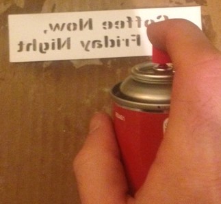Here you can see me applying an even light coat of the adhesive to the back of the stencil. Make sure you let the adhesive dry for some time and set so that it rests permanently to the stencil.