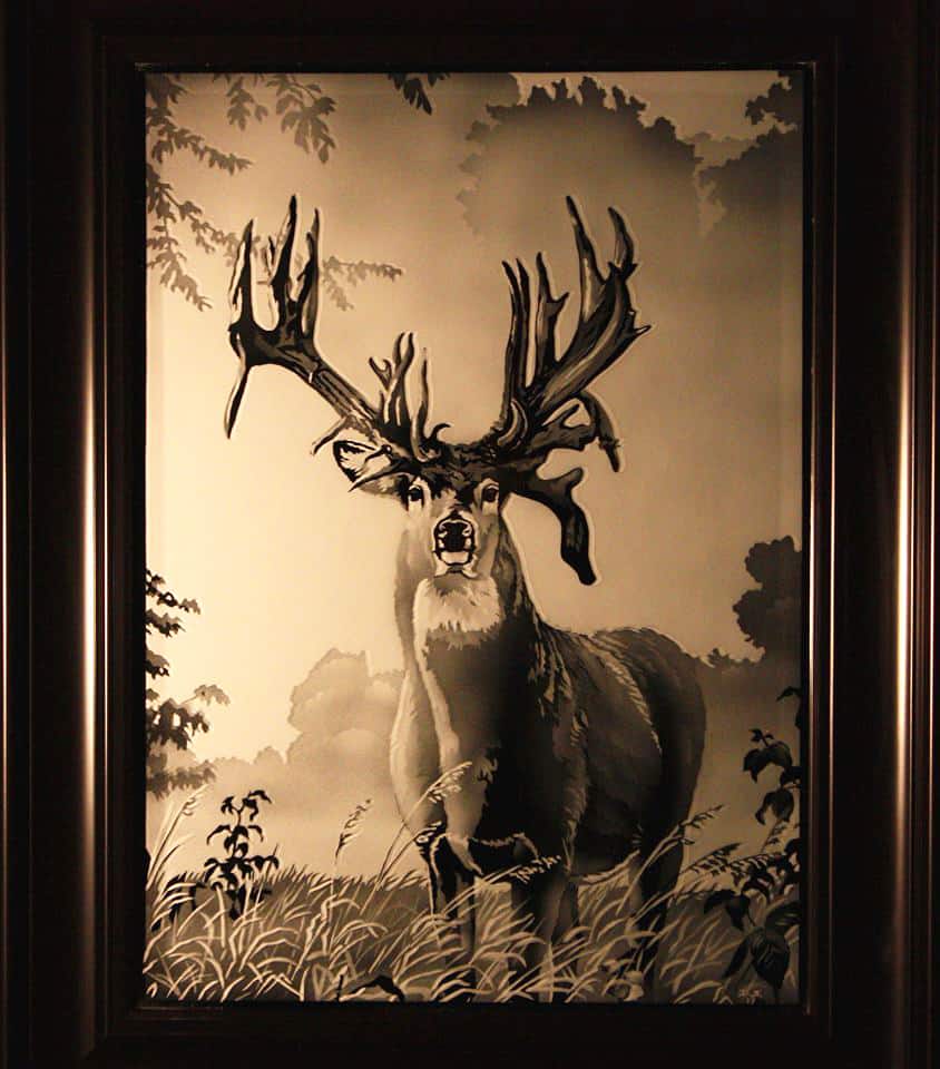 The above is a beautiful outdoor scene etched by Dave in what I believe is a framed glass mirror. All the detail in the grass, deer head and antlers is awesome. The beauty of this is the centerpiece is made of nothing but lightly abraded glass.